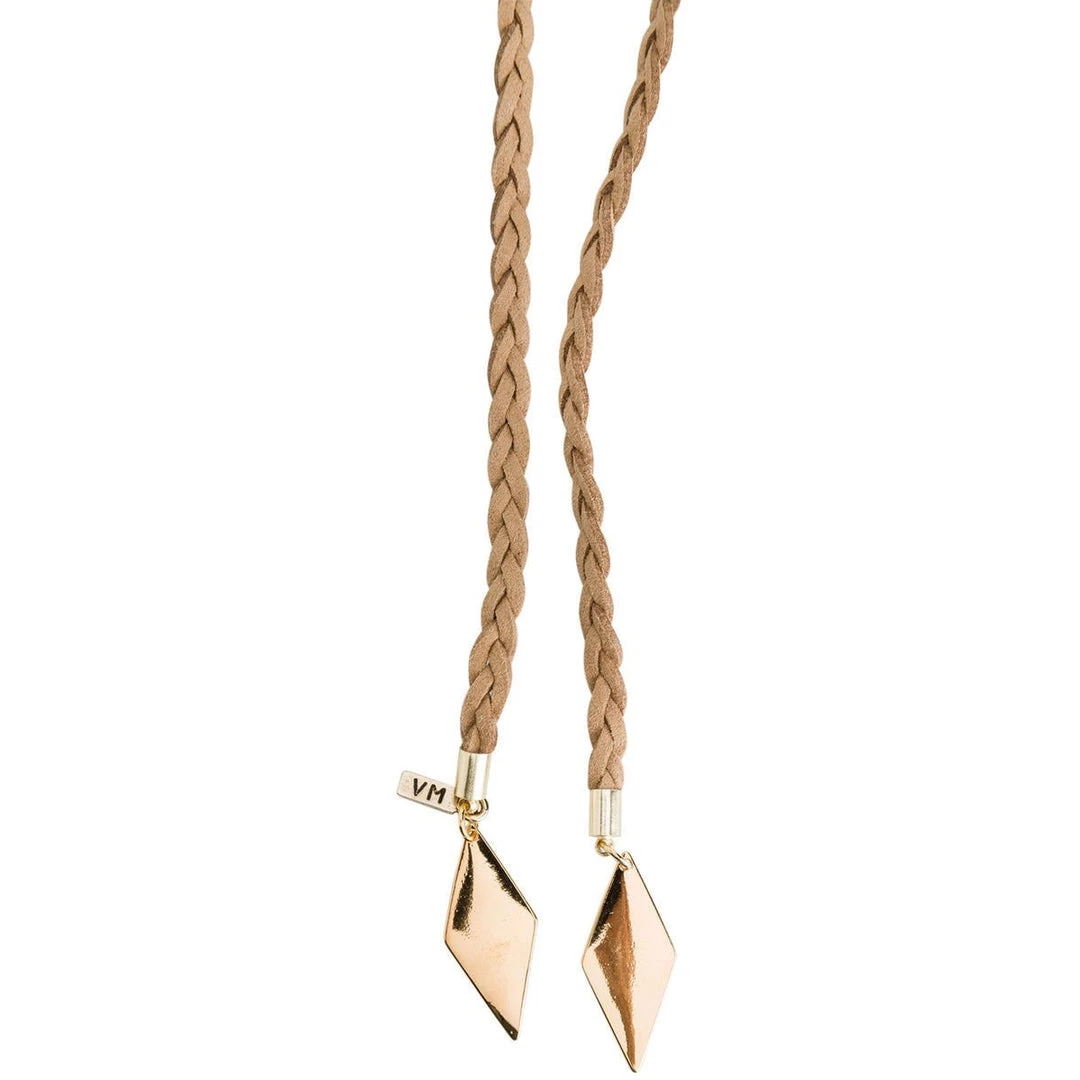 The Braided Diamond Bolo by Vanessa Mooney is a tan, braided suede bolo necklace with gold diamond shaped charms at both ends.
