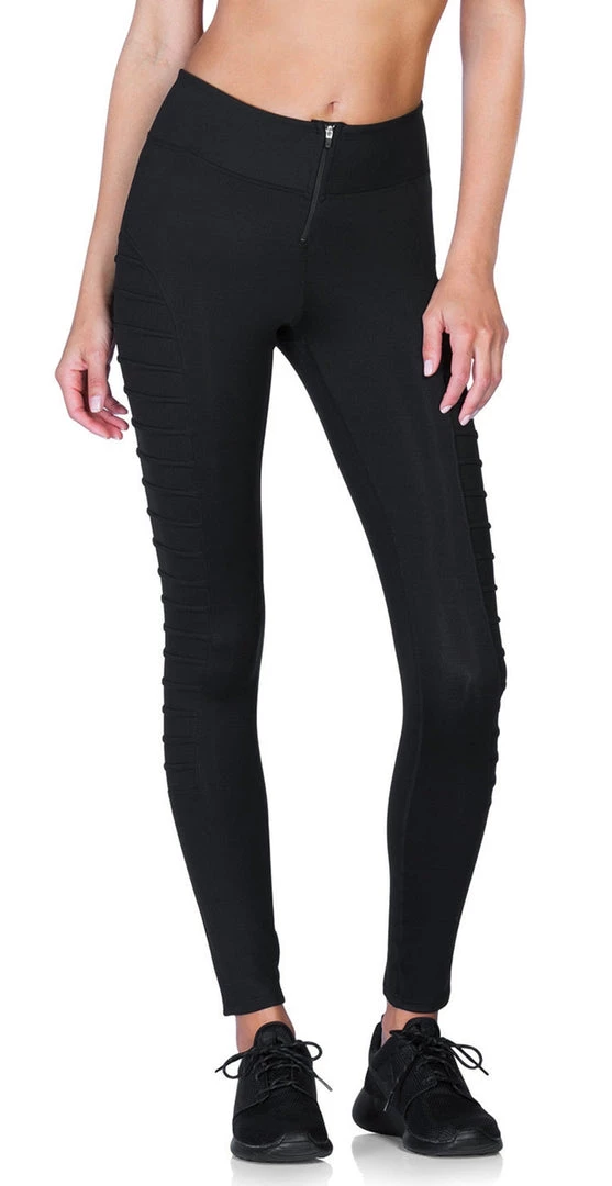 Fit: Mid-rise legging with front zipper and side pintuck details H20 resistant