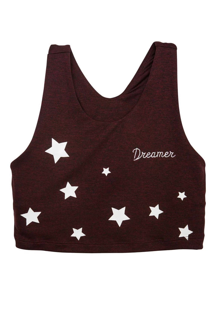 Take on the universe in Spiritual Gangster’s Dreamer Tech Crop Bra featuring scattered stars, “dreamer” embroidery, and a hidden moderate support athletic bra below top layer. Made from tri-blend jersey with the perfect amount of support and stretch.