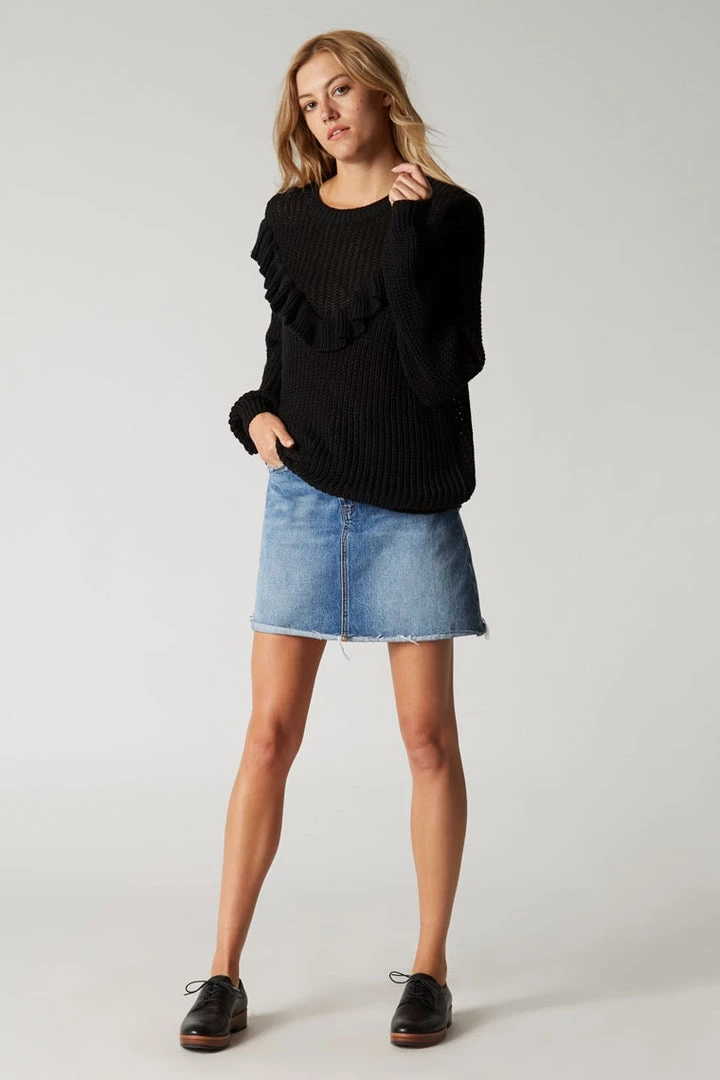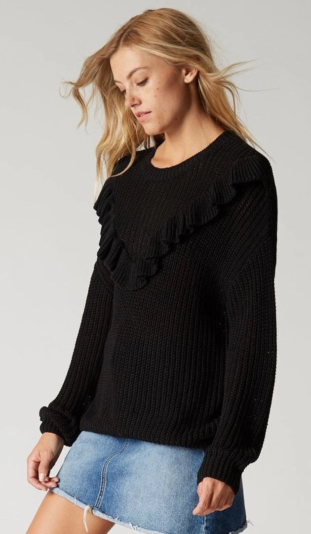 Bring on cooler temps with Blanks Black of Night Sweater. This gorgeous knit will you keep you warm while still feeling lightweight. It features a ruffle overlay on the chest. Your new favorite black sweater.