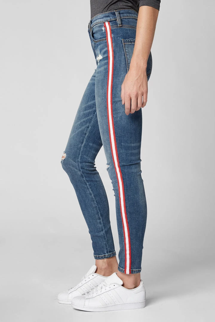 The Bond high-rise jeans in medium dark wash with red and white side striped and distressed details.