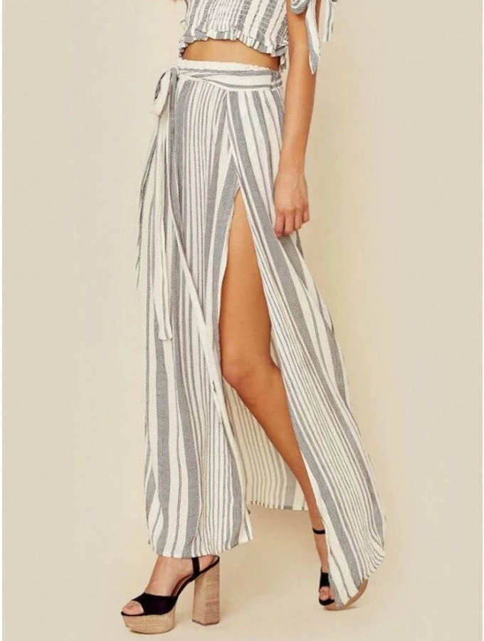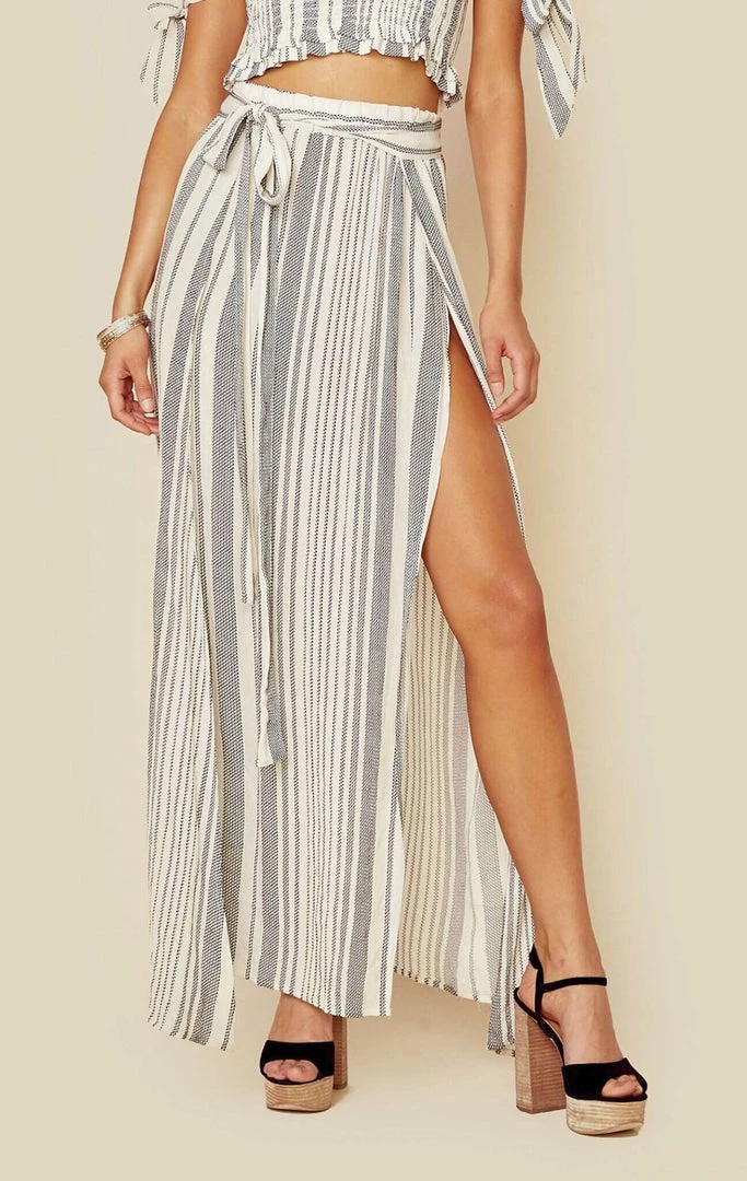 Blue Life Grace Skirt features a new boho stripe print throughout, high cut slits, and wrap style waist with self tie detailing.