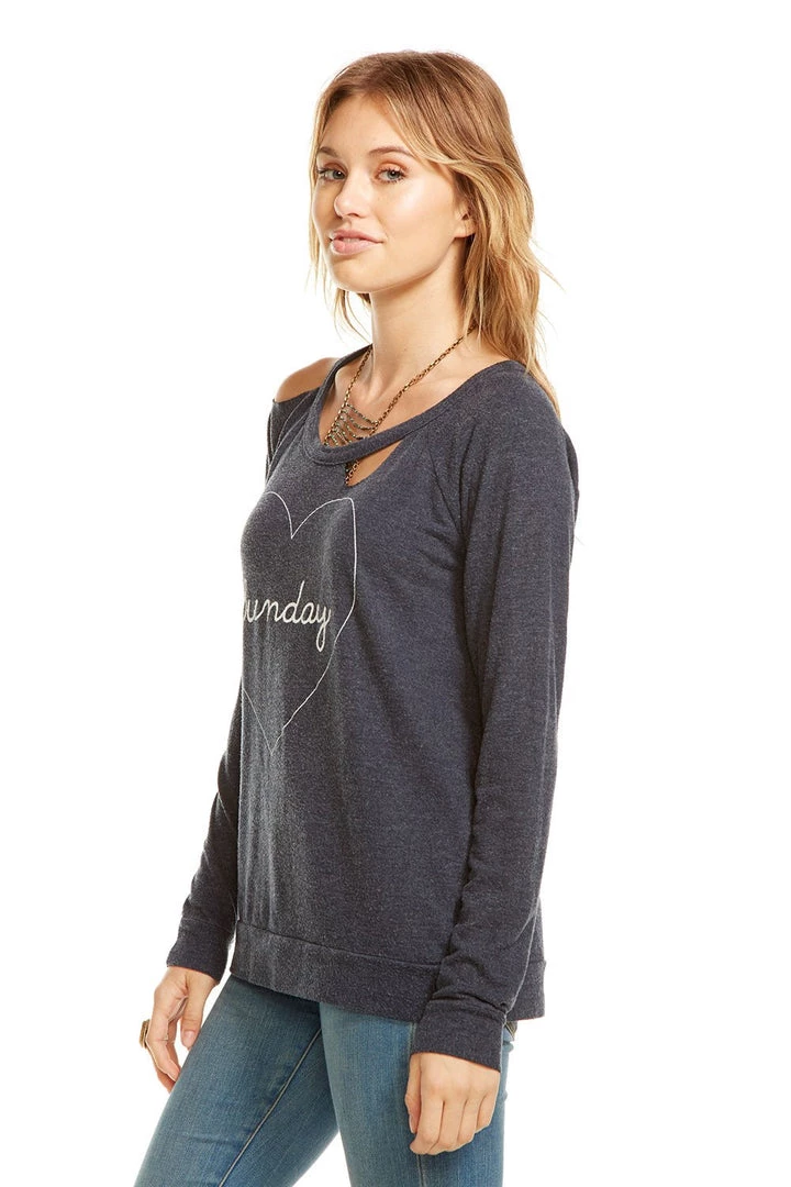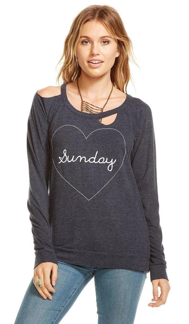 Get comfy & cozy in Chaser’s Heart Sunday Pullover. This long sleeve knit features a graphic heart and Sunday lettering, cut out back, and distressing. You’ll never want to take this off!