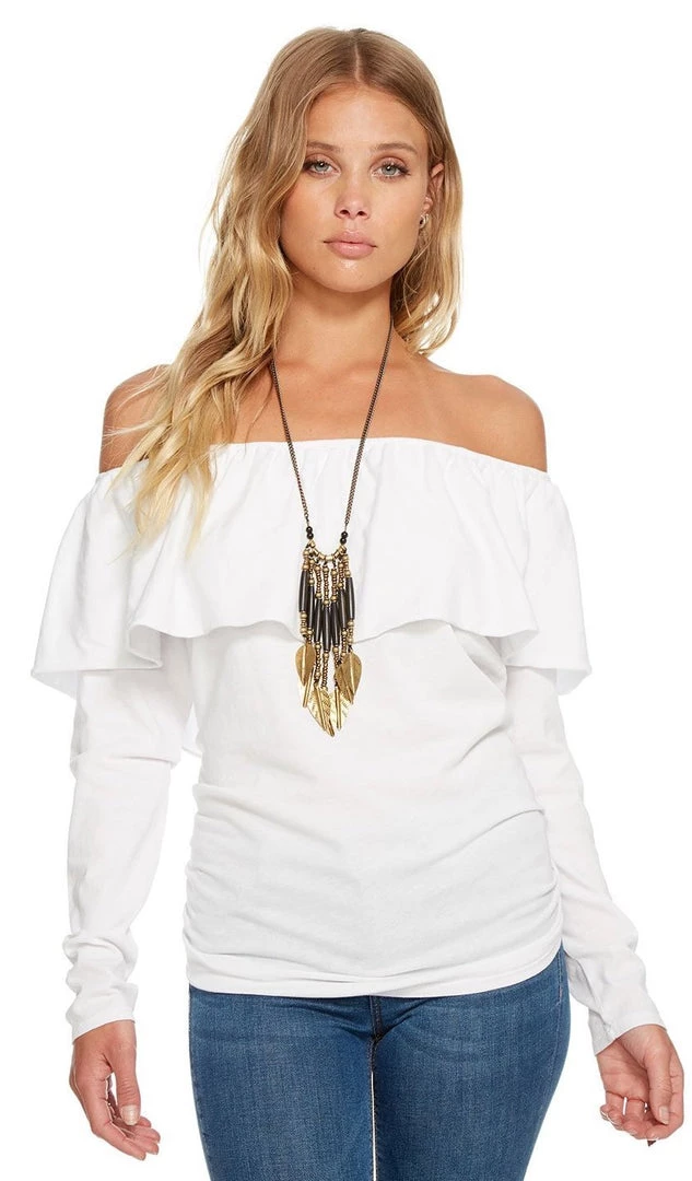 Take long sleeve to a whole new level with Chasers Gauzy Cotton Jersey off the shoulder long sleeve. Throw on with your favorite bottoms for the perfect date night look.