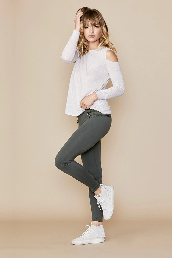 David Lerner’s classic legging gets a new twist that features contrasting wrap-around rose gold zip details. These are perfect for any active situation and just as perfect for a casual outing.