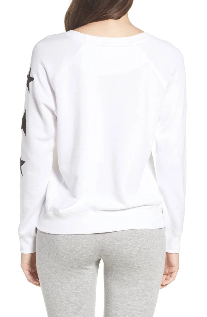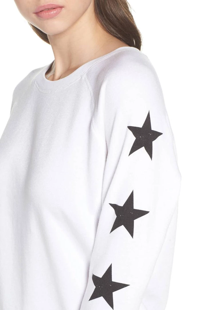 Three stars adorn the left sleeve of our David Lerner NY Studio Collection French Terry Raglan Pullover Sweatshirt with vintage soft hand print.