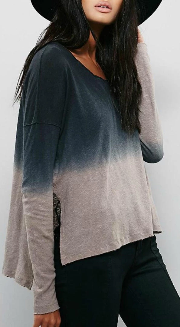 Fit: Ombre effect with an unfinished trim. High low hem and side vents.
