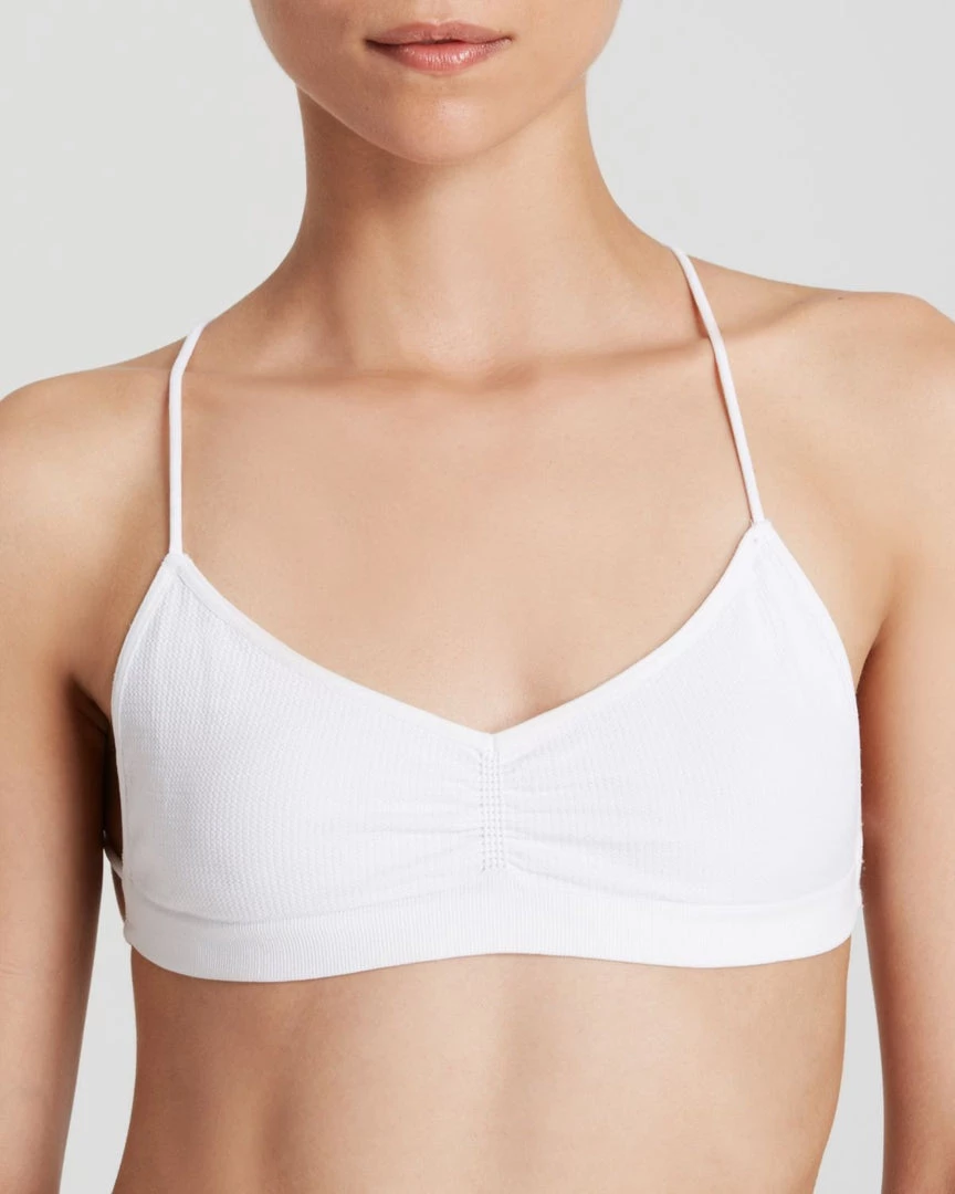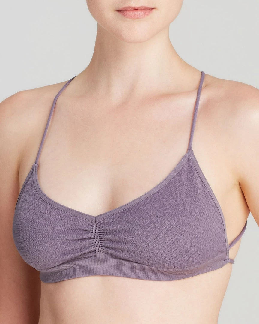 Fit: Seamless strappy back bra with ruched bust and stretchy fit all over.