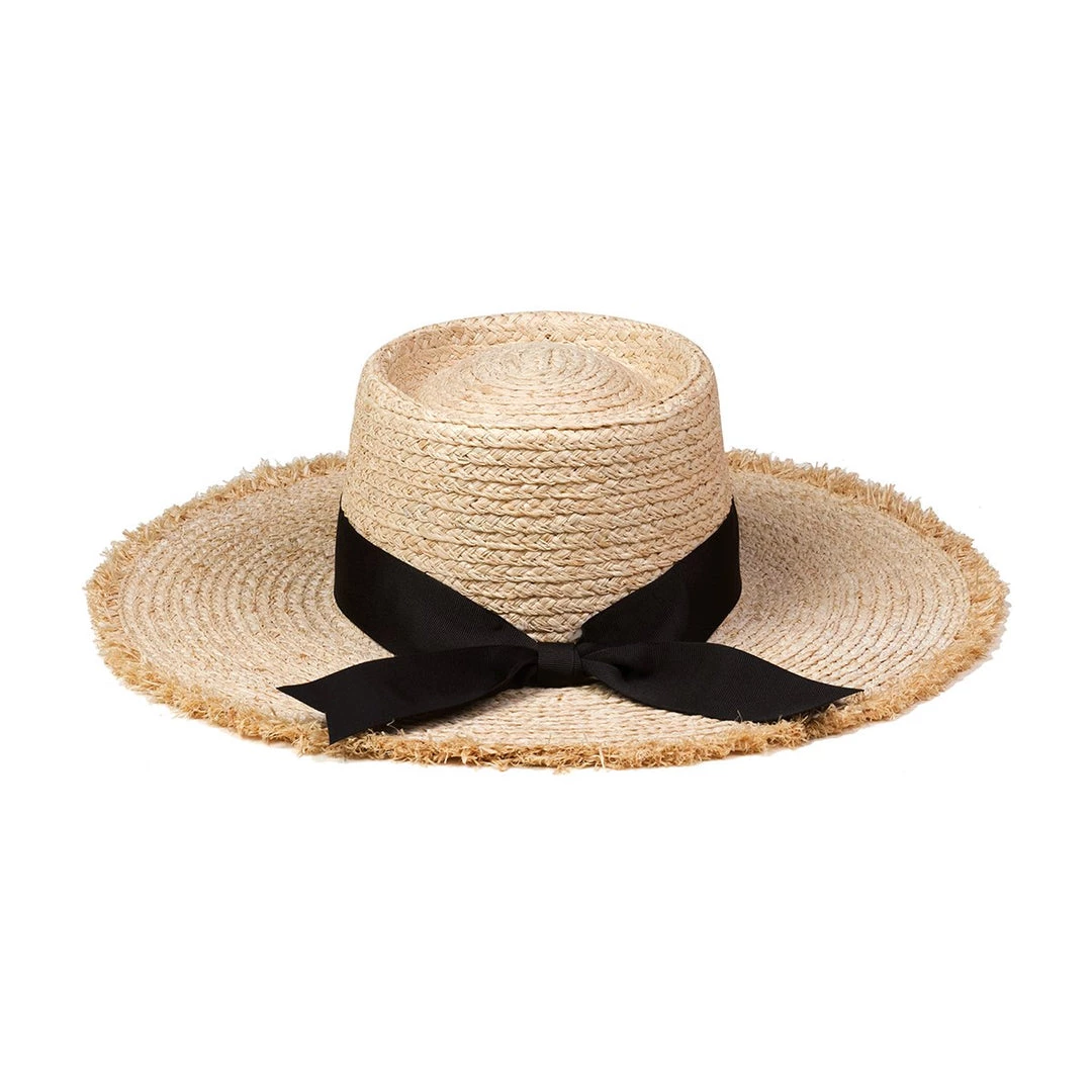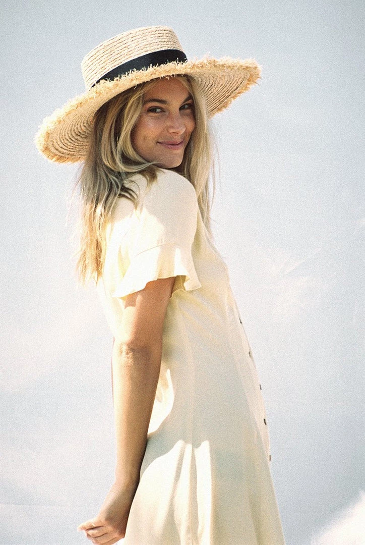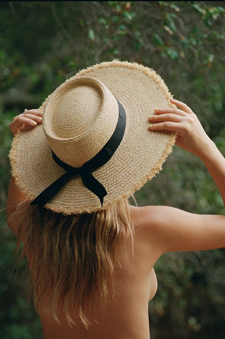 Forever on vacation in Lack of Color’s Ventura Hat. This straw hat features frayed raffia edging and is trimmed with a black grain ribbon.
