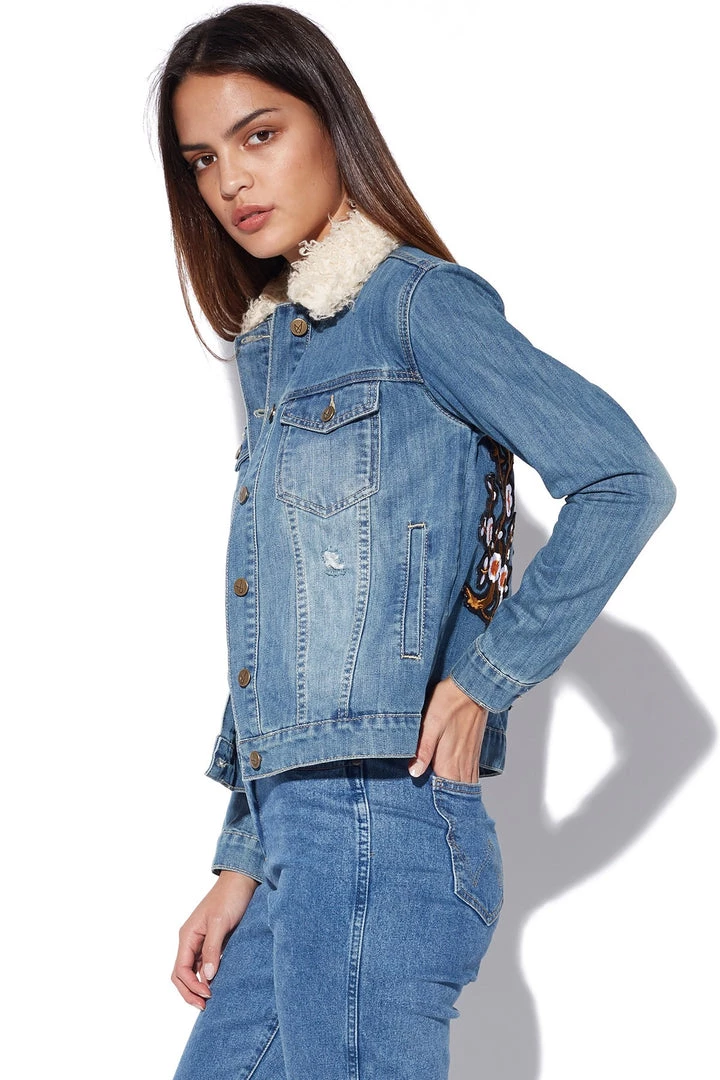 Mink Pink’s Into the Wild Tiger Blossom Denim Jacket isn’t your average denim jacket. No- this bold jacket is fun. It features a sherpa fleece collar, and an embroidery design of a tiger, cherry blossoms, and butterflies on the back. It also features the perfect amount of distressing. Never second guess a denim jacket, and this one is a must have!