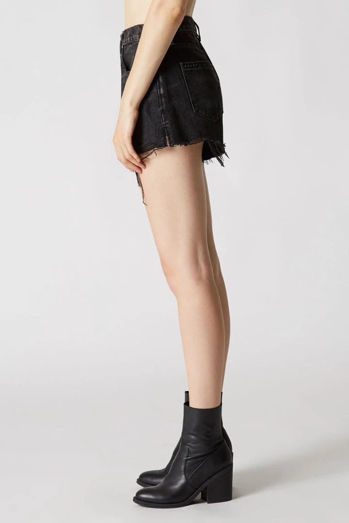 High rise short in a muted black wash with black stitching.