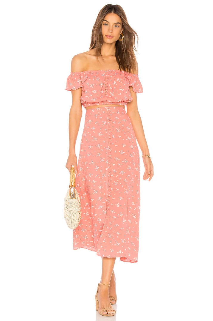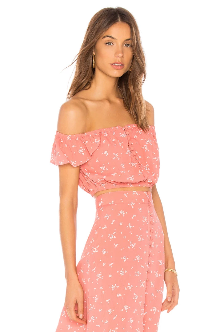 Flynn Skye’s Tori Top is a sweet and sexy crop top that features ruffled off-the-shoulder elastic sleeves and buttons running down the front. So cute!