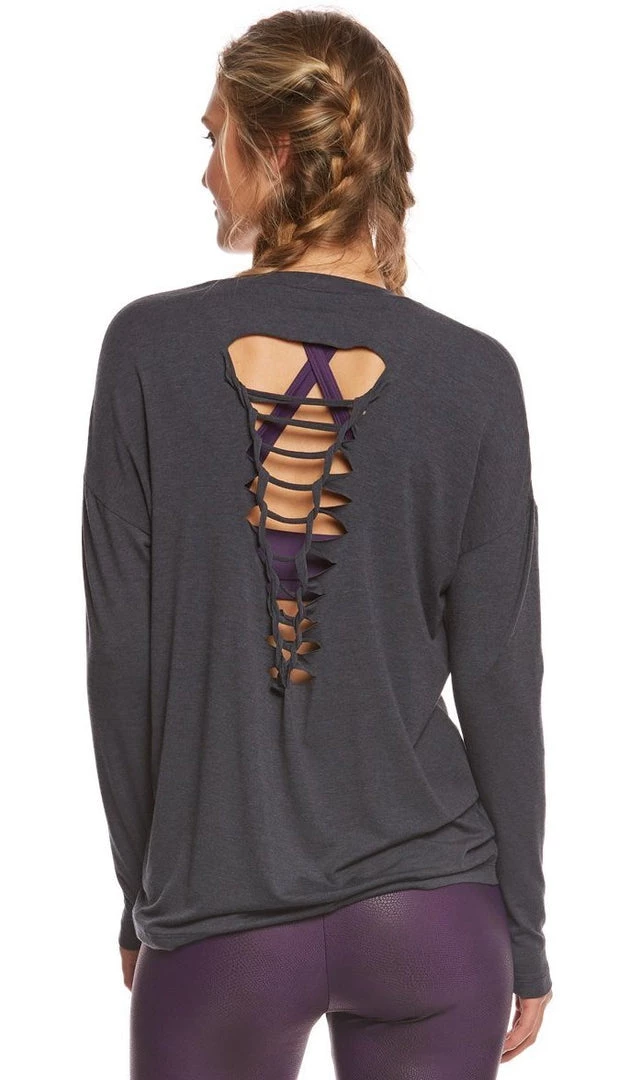 Onzie performance top with braided cutout back. Crew neckline. Dropped shoulders.