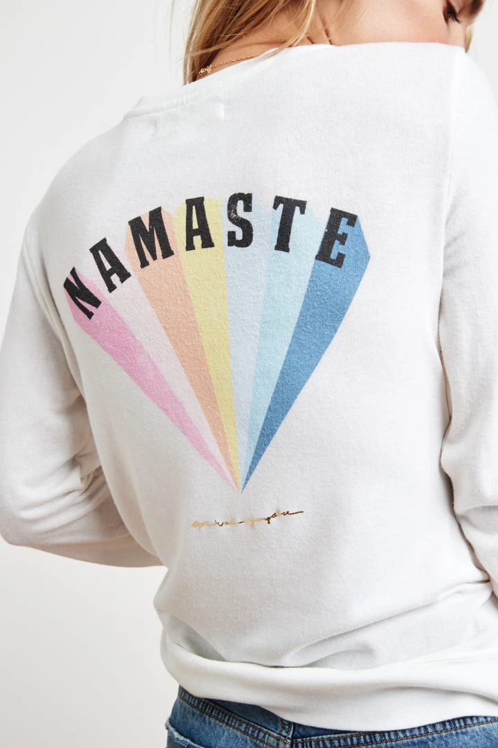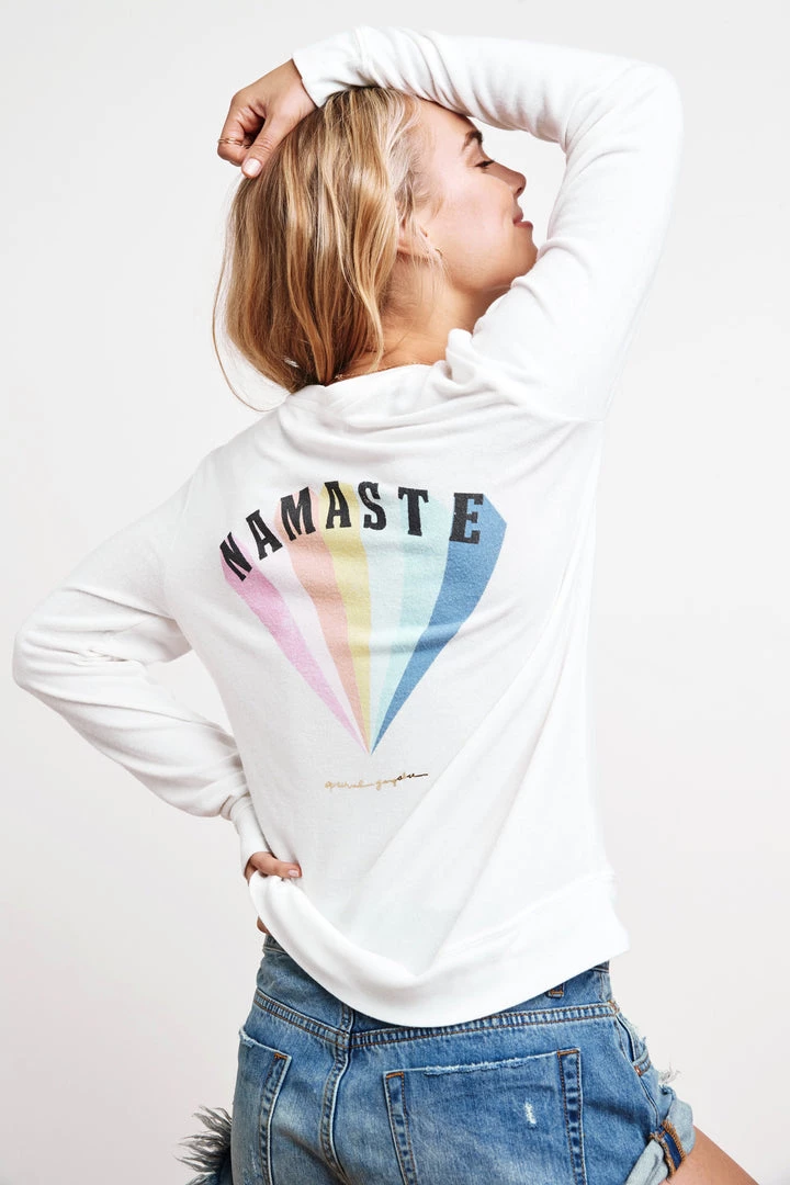Find your own Namste in Spiritual Gangster Namaste Rainbow Vneck Pullover. This super soft v-neck pullover features a mini peace patch and ‘Namaste rainbow’ back graphic. Made from a lightweight tri-blend sweater knit for a slightly slouchy fit. Comfy & cute? Yes, please!