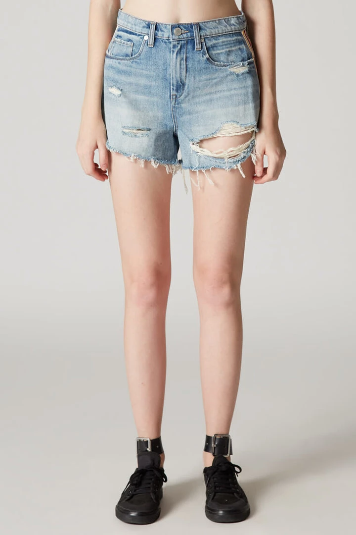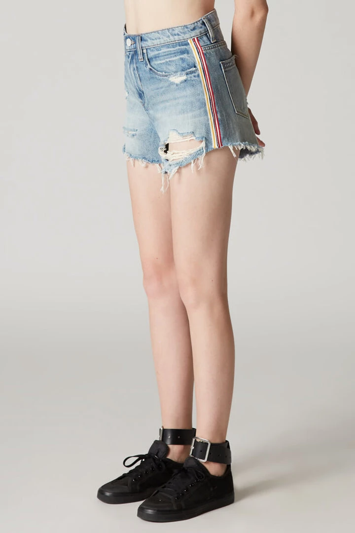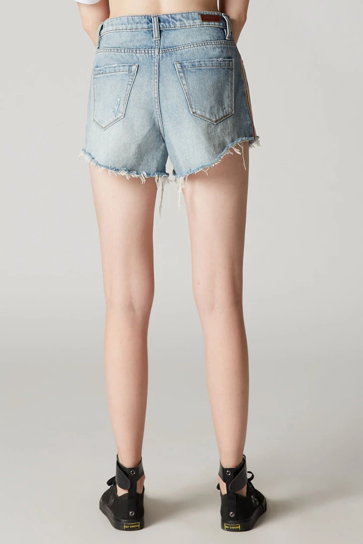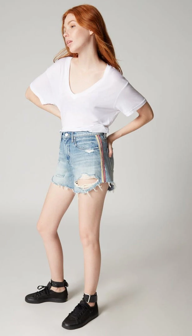 Our favorite high rise shorts done in a light wash with a racing stripe at each side.