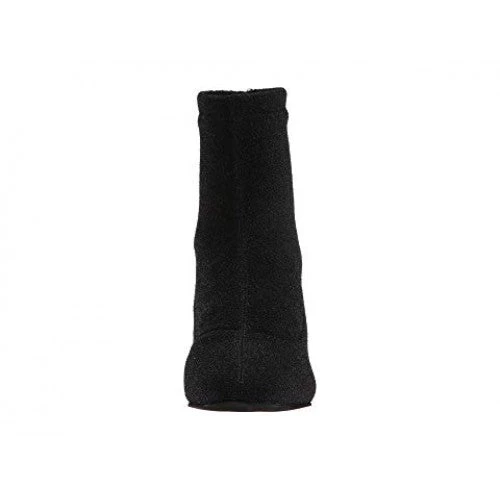Pointed Sol Sana booties with black metallic double-knit shafts and stacked block heels. Rubber sole.