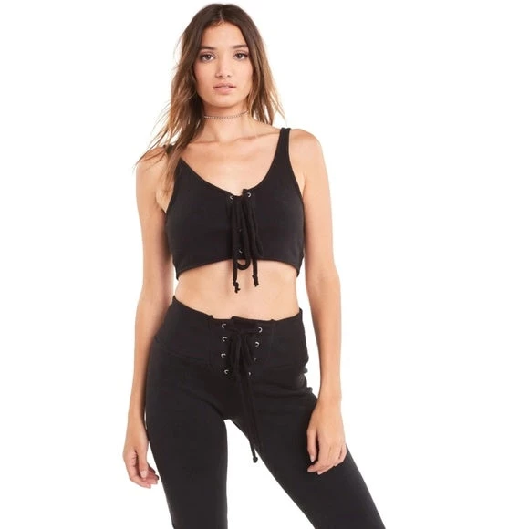 The Cady Tank is a cropped, fitted top knit in a super soft sherpa fleece, with front lace up detail.