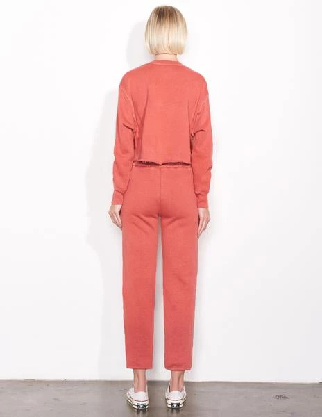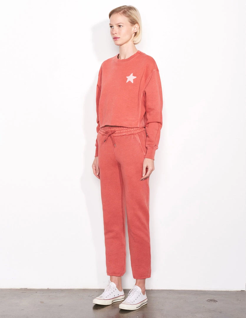 Cropped pullover cute in a heavy fleece fabrication. Featuring a raw hem and a chenille star patch.