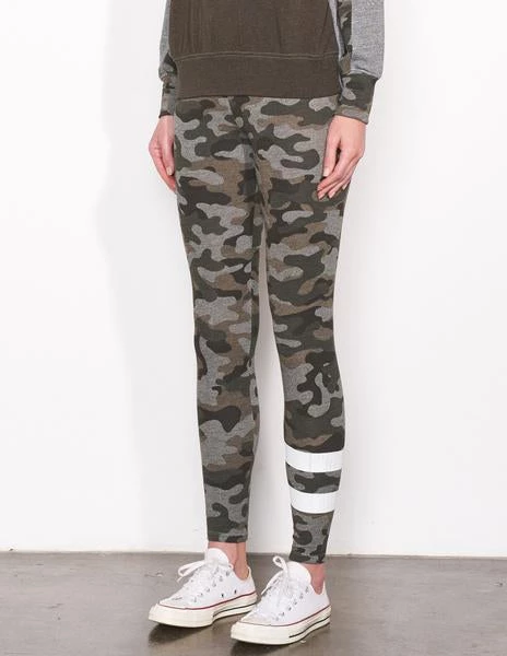 The best selling yoga pants cut in an ultra stretch fabrication. Featuring an all over camo print and hunter green stripes printed in crackbinder ink. Crackbinder ink creates a unique, cracked print surface when pulled apart after curing. The weathered effect of this ink simulates a vintage, worn-in appearance.