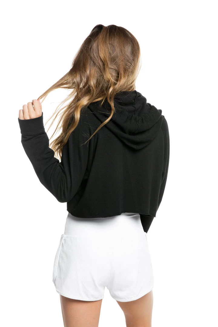 This stylish cropped hoodie is made from french terry fabric with a baggy hood, and an unfinished bottom hem.