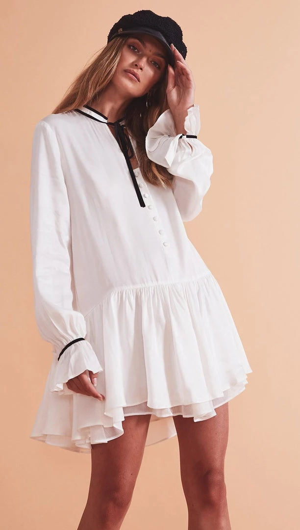 Looking for a unique dress you can dress up or down, or take day to night? Tularosa’s Malia Dress is the perfect one for you. This partially lined dress features a contrast neckline tie detail and a partial front button placket, as well as ruffled hemlines.