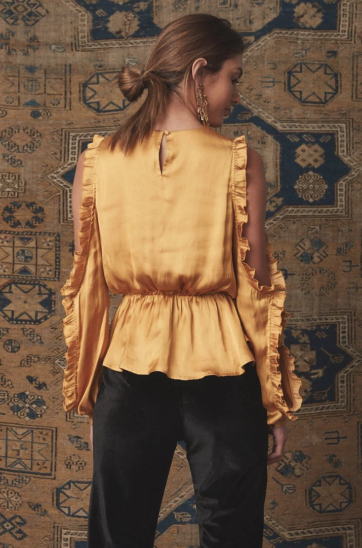 Tularosa’s Shilo Blouse is absolutely gorgeous. This top could be dressed up or down, worn on date night, or to a holiday party. This full lined top features long sleeves with cold shoulder cut outs that extend down the arm, a key hole cut out on the chest with a velvet tie, a keyhole cut out on the back with a button closure, an elasticized waist, and pleated hem. It’s a beautiful addition to your closet.