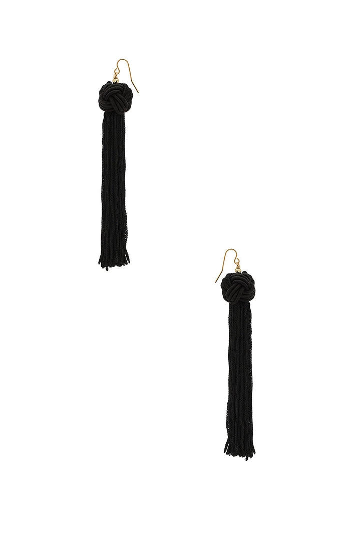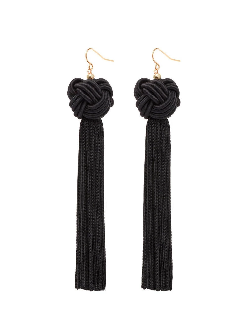 Vanessa Mooney’s Astrid Knotted Tassel Earrings in black are a classy and most wanted pair. Black colored knotted tassel earrings, with gold nuggets on gold plated ear hooks.