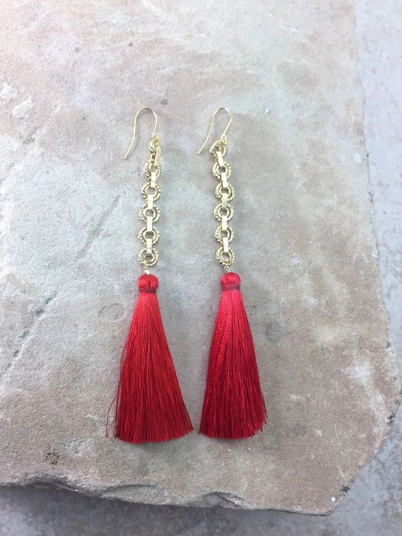 Passionate in Red Silk. Silk Tassel Earrings in Red with Twisted Loop Gold Chain.