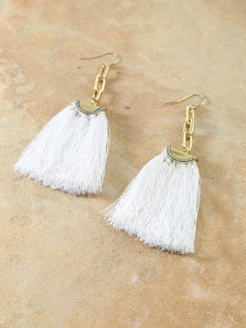 The Kim Tassel Earrings by Vanessa Mooney in ivory feature gold earring studs with a 24K gold overlay, textured chain, and an ivory Tassel with cubic zirconia.