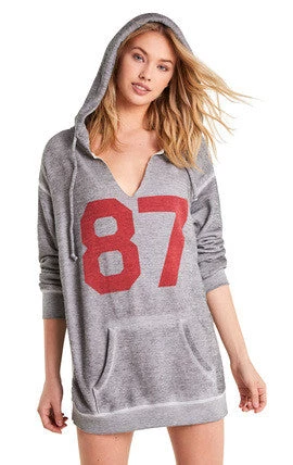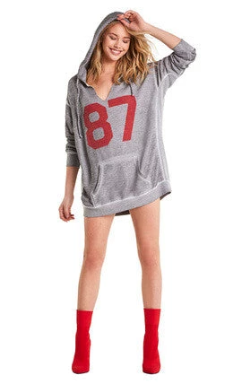 Lucky number 87! The Eighty-Seven Pierce Hoodie is an oversized tunic length hoodie with contrast 1×1 rib hem, cuff, and side panels. In a super soft Heather burnout blend.