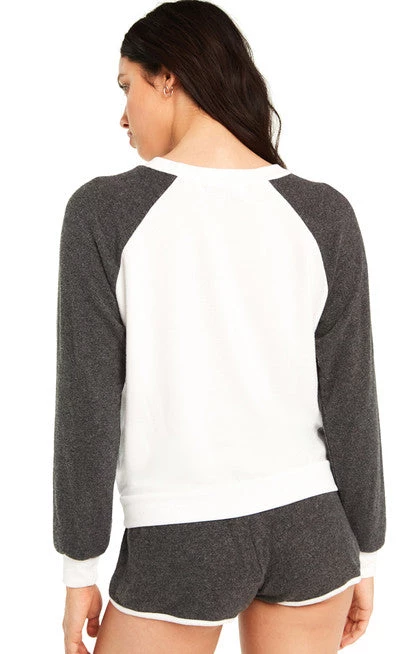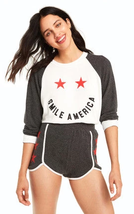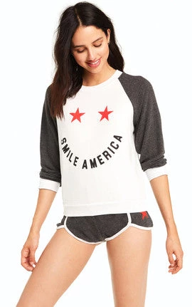 Smile America! The Junior Sweatshirt is a vintage inspired shrunken sweatshirt with raglan sleeves, a crew neck, and banded hems. In a super soft vintage varsity fabric.